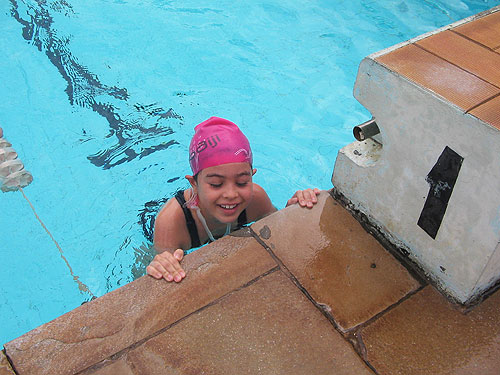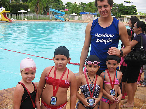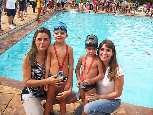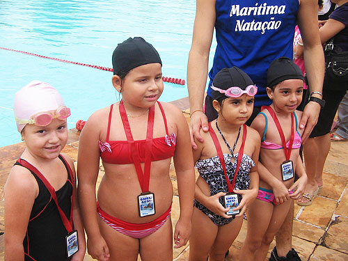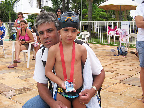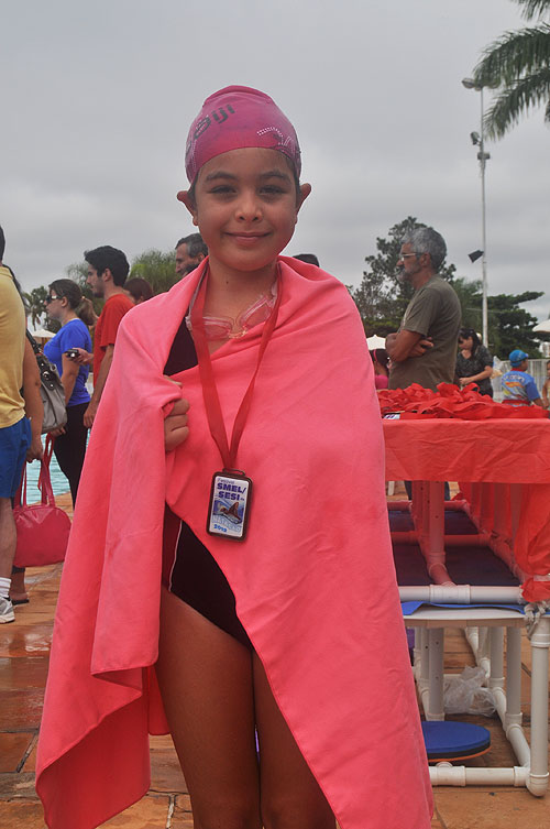 • Desde o início, auxiliada pela professora Chris, a Júlia perdeu o medo da água, aprendeu a nadar em seis meses e atualmente, sabe nadar em todas as modalidades.
